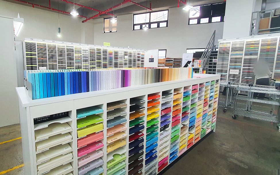 다양한 색상표를 제공하고 있지만, 재고 문제 등으로 색상표에 있는 모든 색상을 보유하고 있는 것은 아니라서 원하는 색상을 찾는 일이 쉽지는 않았습니다. 또한 다양한 사람들이 오가는 곳이기 때문에 예민한 페이퍼는 만질 수 없는 점은 당연하지만 한편으론 질감과 두께를 샘플표로만 확인해야하는 점 또한 아쉬운점으로 남는 것 같습니다.