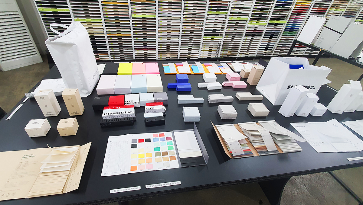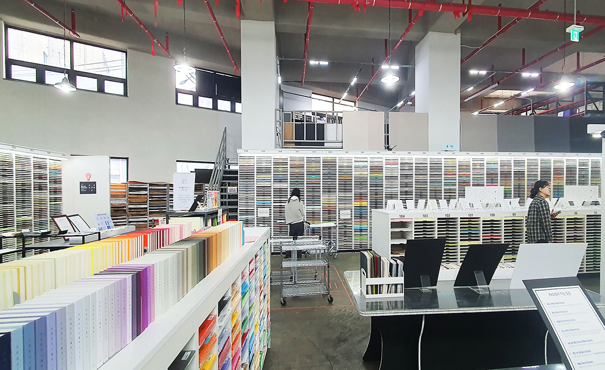 매장 내부는 도서관과 같은 조용한 분위기로, 벽면을 가득 채운 하얀 선반에 색상, 재질, 모양, 두께가 각기 다른 종이들이 빽빽이 꽂혀 있습니다. 또한, 종이로 만들 수 있는 굿즈 샘플들도 볼 수 있고 정갈하게 정리된 색상표 등 종이 샘플북과 다양한 패키지 샘플들이 전시되어 있어, 디자이너들이 참고할 만한 요소들이 풍부합니다.